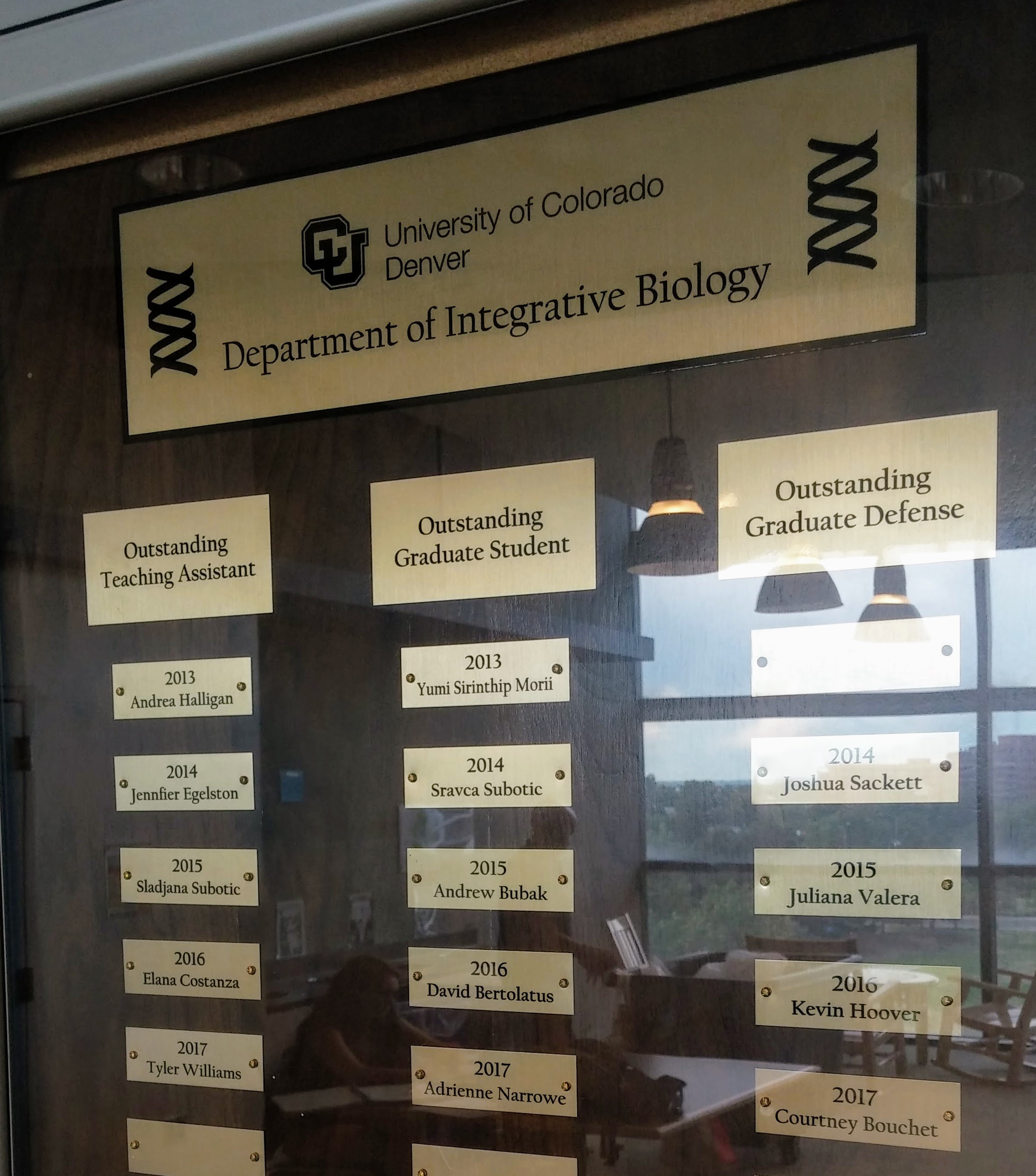 The lab feels like it’s emptying out, with 1 PhD, 1 MS, and 2 BS graduates this May. Congratulations to: Dr. Adrienne Narrowe, PhD (with both the College of Liberal Arts and Sciences and the Department of Integrative Biology outstanding Defense awards) David Banks-Richardson, MS Biology Maria Nikulkova, BS Biology Connor Jacobs, BS Biology